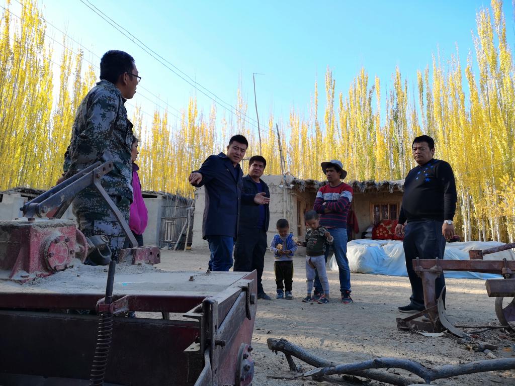 在“访惠聚”工作队的协调下,服务团队到喀孜纳克村的农机大户进行实地调研,深入了解村农机保有量和使用、维护、保养的基本情况。到农户田间地头对红枣、核桃种植情况和土地沙化情况进行了实地调研,并提出绿肥改良沙土的具体措施。