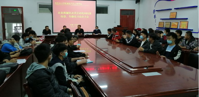 10月10日,学院在工科楼229室召开农业机械化及其自动化2021届本科生收获、冬修实习动员大会,学院副院长张宏,农业工程系副书记范修文,实习带队老师刘扬、牛浩以及农机2021届全体本科学生参加了此次会议。会议由农业工程系副主任李传峰主持。
