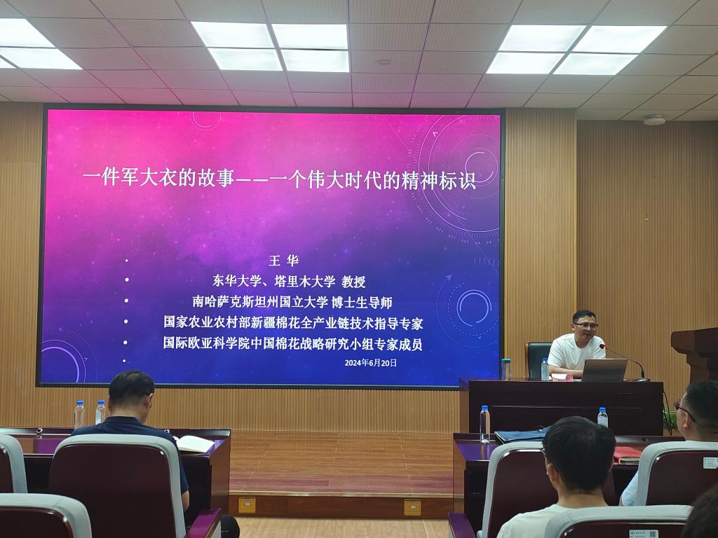 王华以“一件军大衣的故事——一个伟大时代的精神标识”为主题,围绕“伟大建党精神、延安精神、南泥湾精神、兵团精神”,从新疆军区生产建设兵团的初创与发展到西部大开发、共建“一带一路”、新疆22个自由贸易试验区的建立、以及中吉乌铁路项目协议的成功签署等。向我们深刻的讲述了在党的领导下,新疆的伟大发展及目前新疆社会发展的历史机遇。