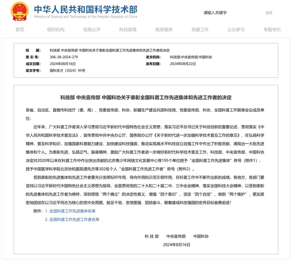 近日,科技部、中央宣传部、中国科协发布《关于表彰全国科普工作先进集体和先进工作者的决定》,对2020年以来在科普工作中作出突出贡献的195个单位和302名个人授予“全国科普工作先进集体”和“全国科普工作先进工作者”荣誉称号。其中,朱古力av
