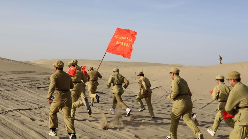 全体人员进行重走沙海老兵路,行进队伍整齐有序,口号嘹亮,精神抖擞,无不彰显着新时代党员的精神风貌和责任感、使命感。