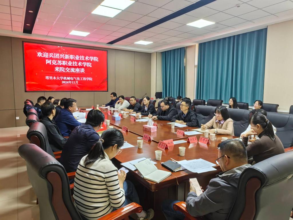 11月7日,兵团兴新职业技术学院机电工程学院副院长郑明理,阿克苏职业技术学院本科教学部党总支书记叶岗带领相关学院教师来院调研交流,与学院党委副书记、院长张宏,教务处副处长朱天生,副院长张有强等领导,在新校区一期机电楼D323会议室进行座谈。
