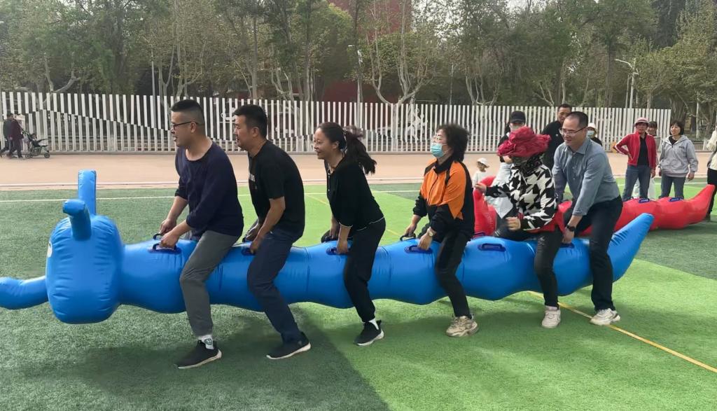 本次运动会设置了“同舟共济、一圈到底、龟兔赛跑、鼓动人心、动力火车”等兼具趣味性与竞技性的项目,既考验个人体能,更注重团队配合。学院教师3-5人一组,喊着统一的口号稳步前进,尽管步伐偶有失衡,却始终相互扶持、默契配合,现场加油声、欢呼声此起彼伏,将现场气氛推向高潮。