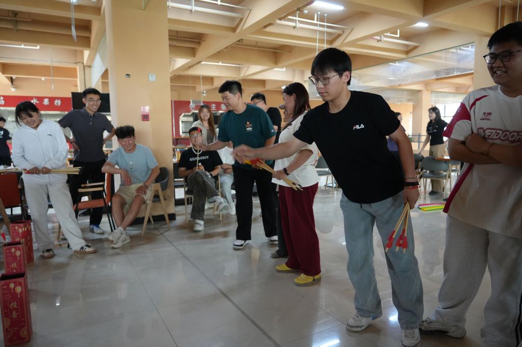 活动设置的三大游戏环节成为凝聚团队力量的核心载体。在党建知识问答中,“铸牢中华民族共同体意识”“新时代党的民族工作主线”等题目引发抢答热潮,参与者在思维碰撞中强化理论素养;“珠行万里”游戏里,10人小组手持槽板协作传递乒乓球,欢呼声中展现出精密配合的团队精神;投壶体验作为传统民俗项目,各组队员在投掷箭矢入壶的限时挑战中展现出默契协作能力。农业工程系党总支准备的钥匙扣、书签等纪念品,既作为活动奖励,也成为民族团结的实物见证。