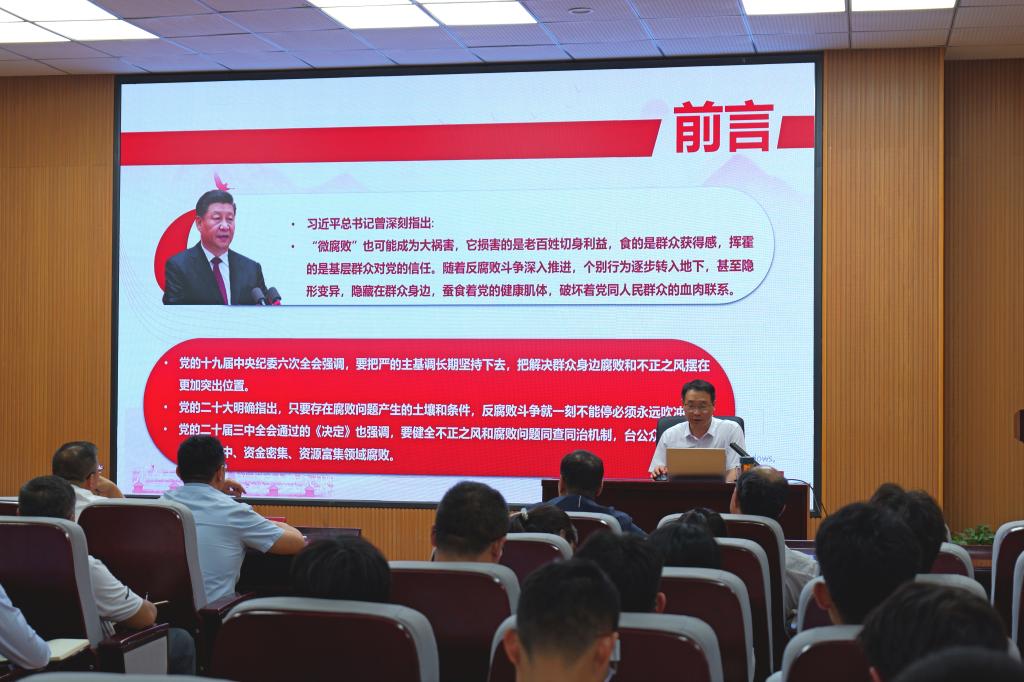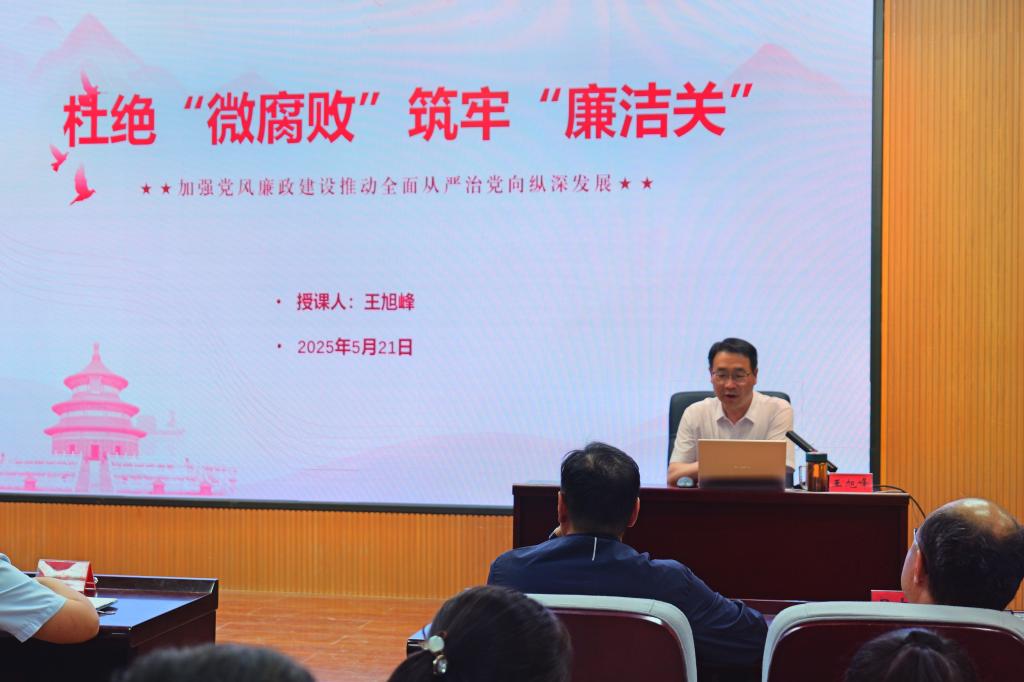 王旭峰从“微腐败”的主要特点、表现形式、主要危害、产生根源、防范措施和将杜绝“微腐败”落到实处六个方面进行深刻阐述。